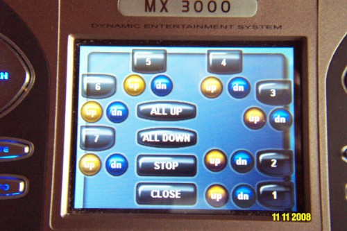 The picture (below) is a recently completed project of a room that has 7-Hunter Douglas Silhouette Shades (labeled 1 thru 7) with master control by a Lutron Graphic Eye system. The shades are also controlled by a Universal Remote Model:MX-3000 touch screen remote controller. The screen on the MX-3000 was programmed by the Audio/Visual company and incorporates both individual and group control of the shades.