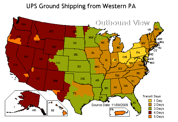 Below is a map indicating the time in transit once your order is shipped from our facility located near Pittsburgh, Pennsylvania.