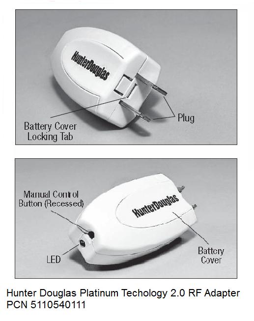 Hunter Douglas Platinum Technology 2.0 RF Adapter Hunter Douglas Part# PCN 2920860000 The Platinum RF Adapter uses current sensing technology to operate PowerRise 2.0 and PowerGlide